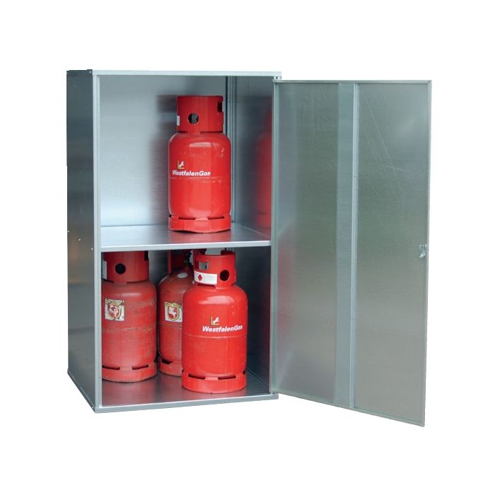 Enkelwandige gasflessenkast voor gasflessen, uitpandige opslag van gasflessen onder druk, volgens actuele regel- en wetgeving. Bescherming tegen weersinvloeden, diefstal en ongeoorloofd gebruik.