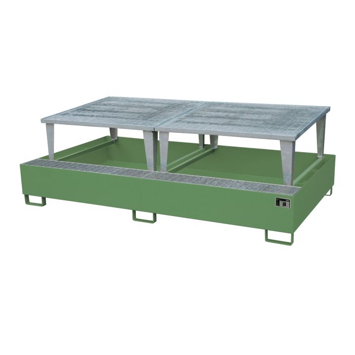 Staal gelakteĀ IBC lekbak voor 2 IBC / KTC van 1.000 ltr. Voor een veilige opslag van verpakte gevaarlijke stoffen overeenkomstig PGS 15 (voorheen CPR 15-1), VLAREM, ARAB, CODEX