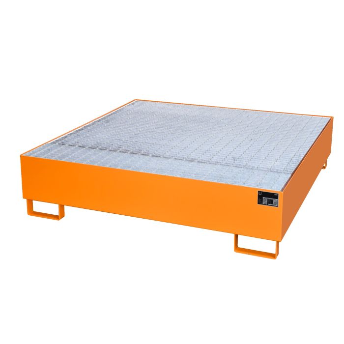 Gelakte lekbak voor 4 vaten van 200 liter of klein emballage. Voor een veilige opslag van verpakte gevaarlijke stoffen overeenkomstig PGS 15 (voorheen CPR 15-1), VLAREM, ARAB, CODEX