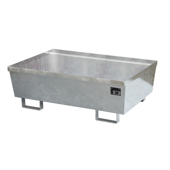 Stalen verzinkte lekbakken, zonder rooster. Voor een veilige opslag van verpakte gevaarlijke stoffen overeenkomstig PGS 15 & VLAREM.