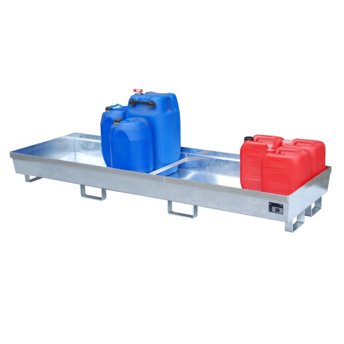 Stalen verzinkte lekbakken, zonder rooster. Voor een veilige opslag van verpakte gevaarlijke stoffen overeenkomstig PGS 15 & VLAREM.