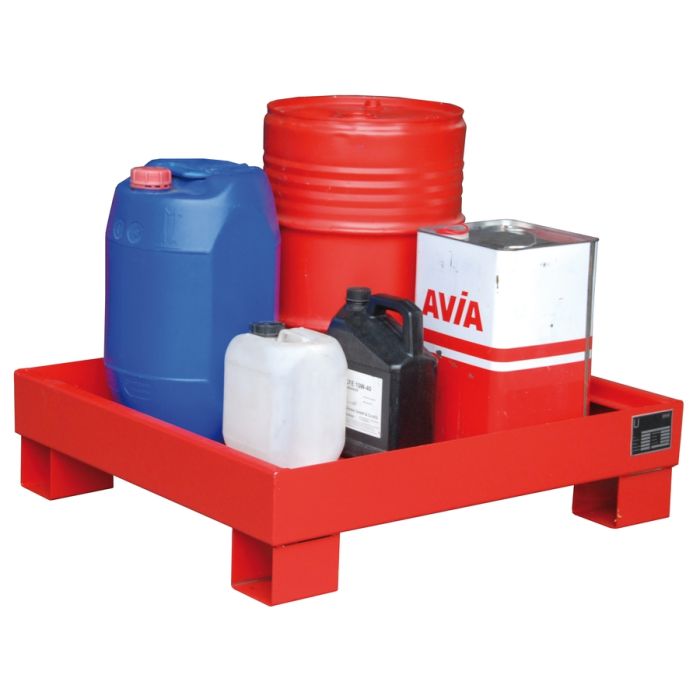 Stalen gelakteĀ lekbakken, zonder rooster. Voor een veilige opslag van verpakte gevaarlijke stoffen overeenkomstig PGS 15 & VLAREM.
