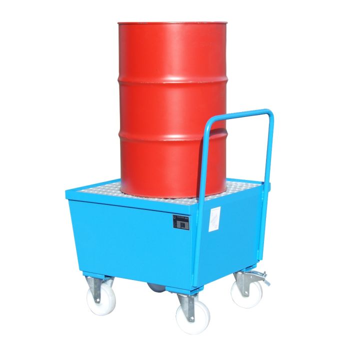 Verrijdbare lekbakken van staal met duwbeugel, met rooster. Met deze verrijdbare lekbakken bent u te allen tijde veilig mobiel aan het werk, in en rondom uw bedrijf. Deze verrijdbare stalen lekbakken zijn handig manouvreerbaar en van zeer degelijke kwaliteit.
