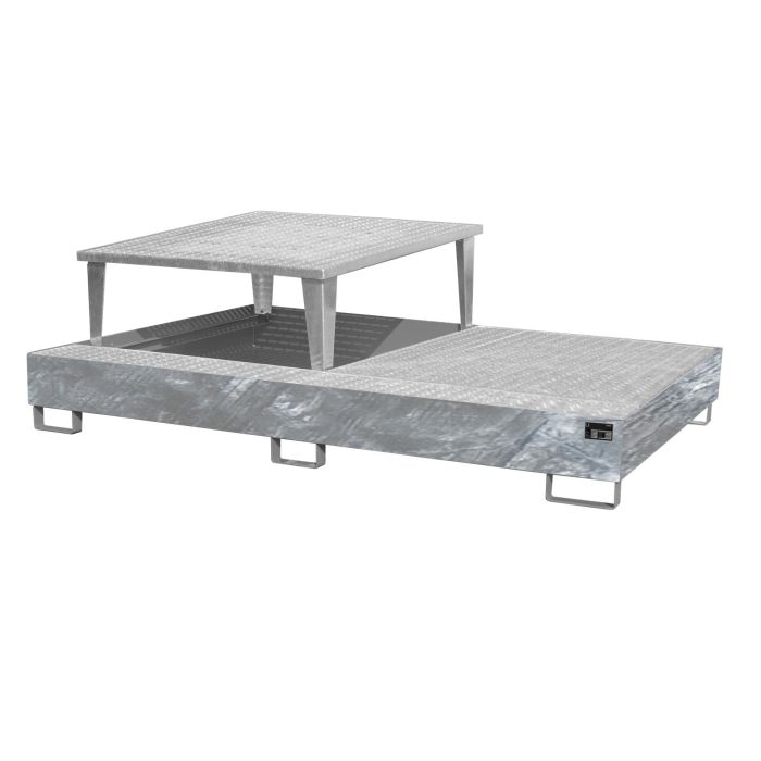 Staal verzinkte IBC lekbakĀ voor 2 IBC / KTC van 1.000 ltr. Voor een veilige opslag van verpakte gevaarlijke stoffen overeenkomstig PGS 15 (voorheen CPR 15-1), VLAREM, ARAB, CODEX